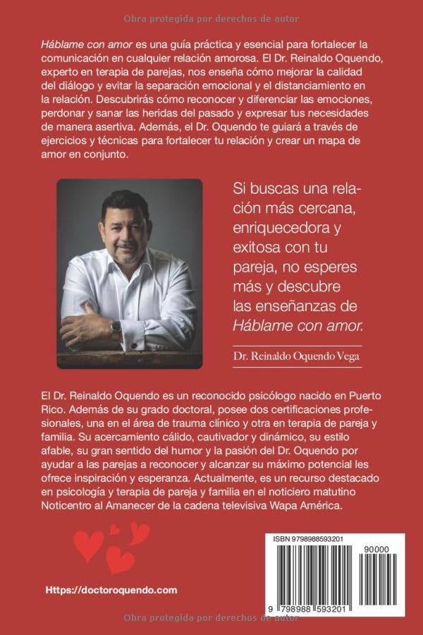 Si buscas una relación más cercana, enriquecedora y exitosa con tu pareja, no esperes más y descubrelas enseñanzas de Háblame con amorHáblame con amor es una guía práctica y esencial para fortalecer la comunicación en cualquier relación amorosa. El Dr. Reinaldo Oquendo, experto en terapia de parejas, nos enseña cómo mejorar la calidaddel diálogo y evitar la separación emocional y el distanciamiento en la relación. Descubrirás cómo reconocer y diferenciar las emociones, perdonar y sanar las heridas del pasado y expresar tus necesidades de manera asertiva. Además, el Dr. Oquendo te guiará a través de ejercicios y técnicas para fortalecer tu relación y crear un mapa de amor en conjunto.El Dr. Reinaldo Oquendo es un reconocido psicólogo nacido en Puerto Rico. Además de su grado doctoral, posee dos certificaciones profe- sionales, una en el área de trauma clínico y otra en terapia de pareja y familia. Su acercamiento cálido, cautivador y dinámico, su estilo afable, su gran sentido del humor y la pasión del Dr. Oquendo por ayudar a las parejas a reconocer y alcanzar su máximo potencial les ofrece inspiración y esperanza. Actualmente, es un recurso destacado en psicología y terapia de pareja y familia en el noticiero matutino Noticentro al Amanecer de la cadena televisiva Wapa América.
