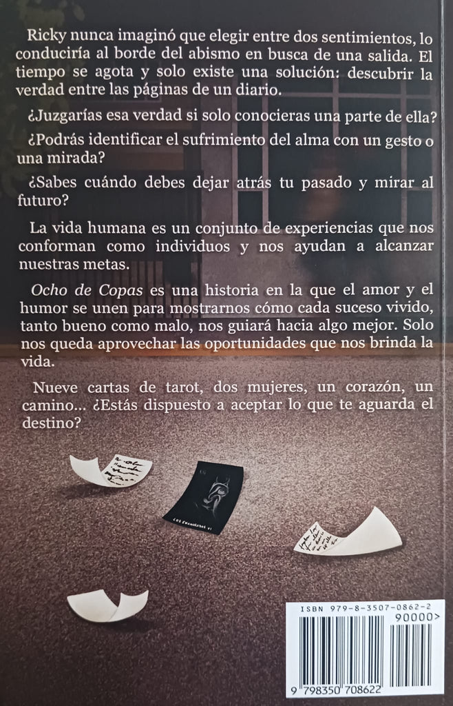 Ocho de Copas es una hostoria en al que el amor y el humor se unen para mostrarnos como cada suceso vivido, tanto bueno como malo, nos seguiran hacia algo mejor. Solo que nos queda aprovechar las oportunidades que nos brinda la vida.